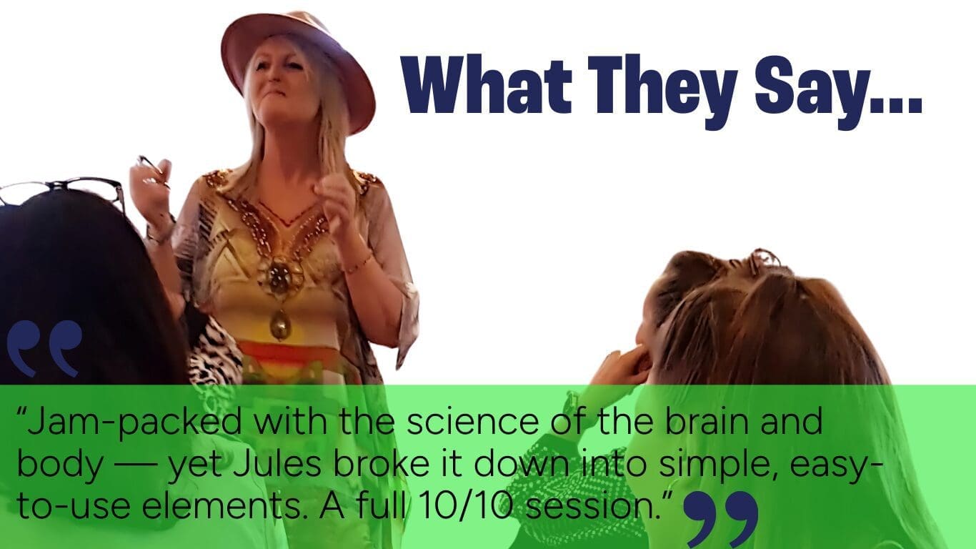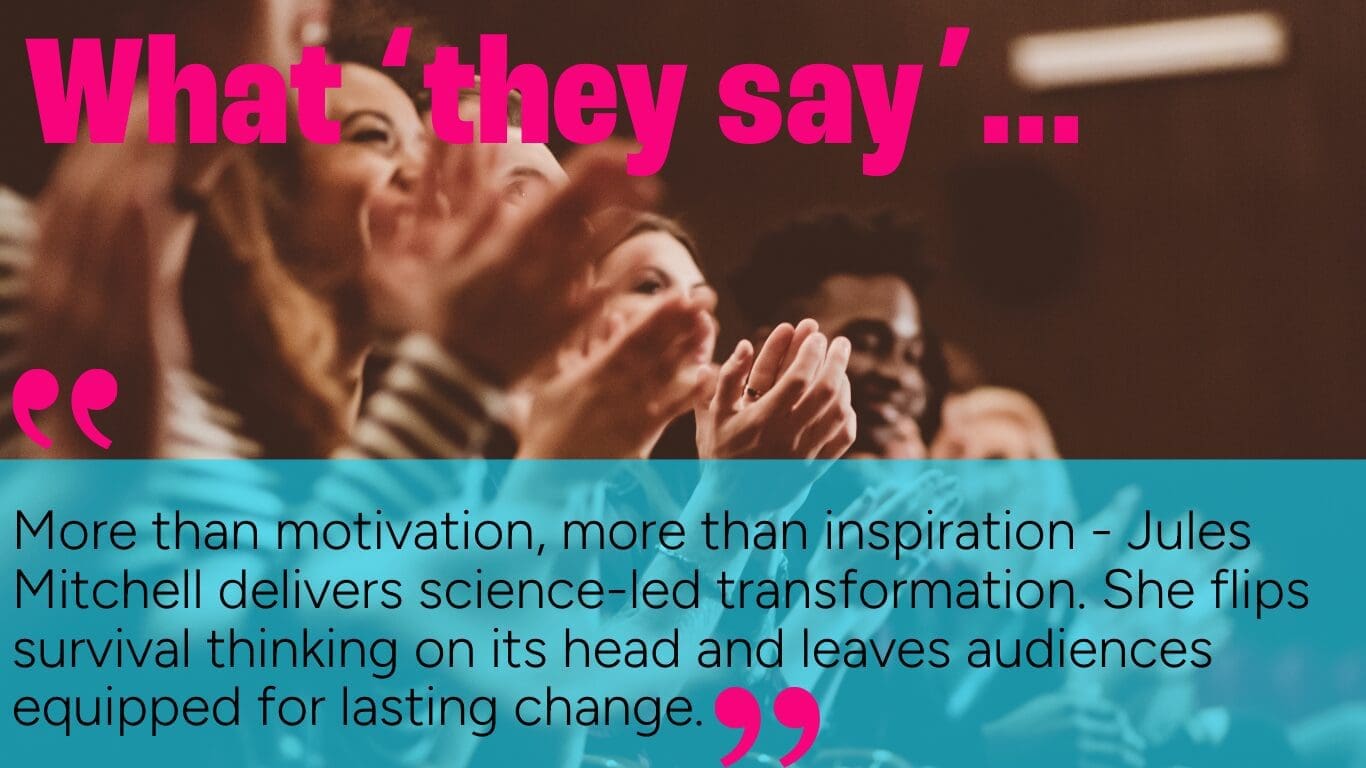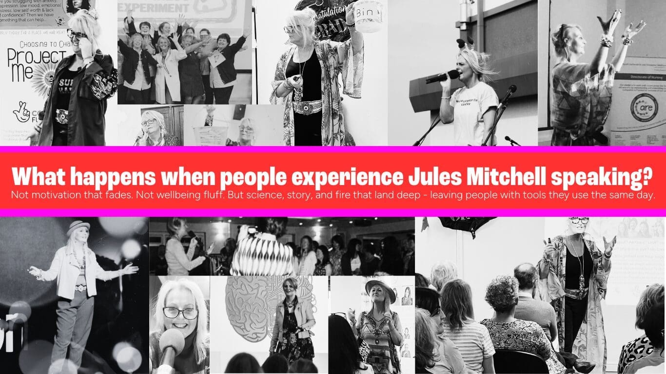 When you bring Jules in, you give your teams the chance to break free from survival mode, reconnect with purpose, and ignite their brilliance. This isn’t about temporary inspiration – it’s about sparking lasting change that transforms how they show up at work and in life.